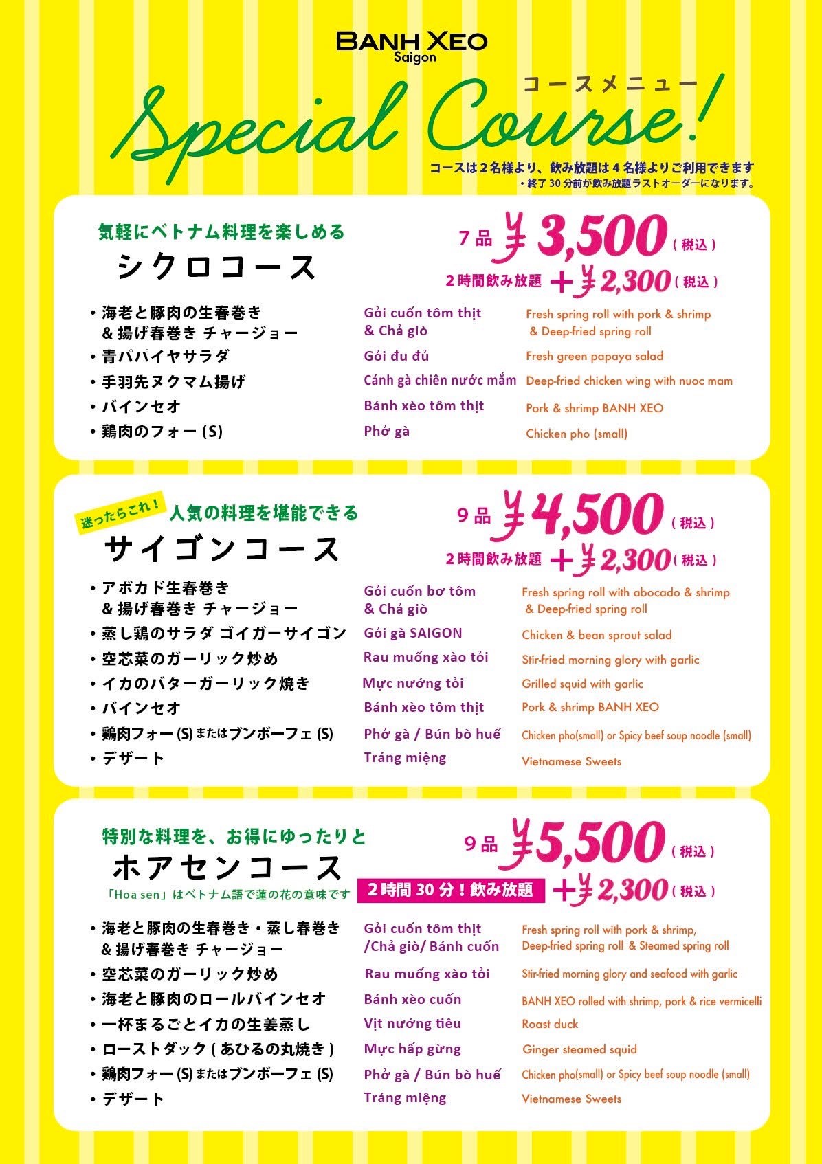 バインセオサイゴン新宿店のコースは、メニュー品数も多く、色々な料理をお得に楽しめるコースでおすすめです。